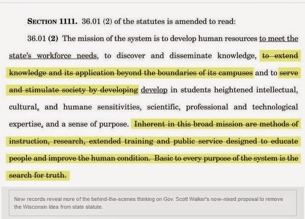 "Gov. Scott Walker's administration gave detailed, line-by-line instructions about how to strike the decades-old Wisconsin Idea from state law — even as top university officials objected — according to legislative drafting notes reviewed by the State Journal." (DeFour, Hall, Spicuzza and Simmons, Wisconsin State Journal, Feb. 6)